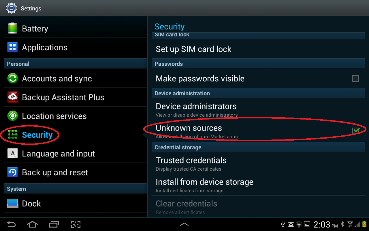 2. Scroll and Tap on Security, look under Security on the right side, checkbox tap “Unknown Sources” which will allow installation of non-Market apps (Ranger SST CommLink App).