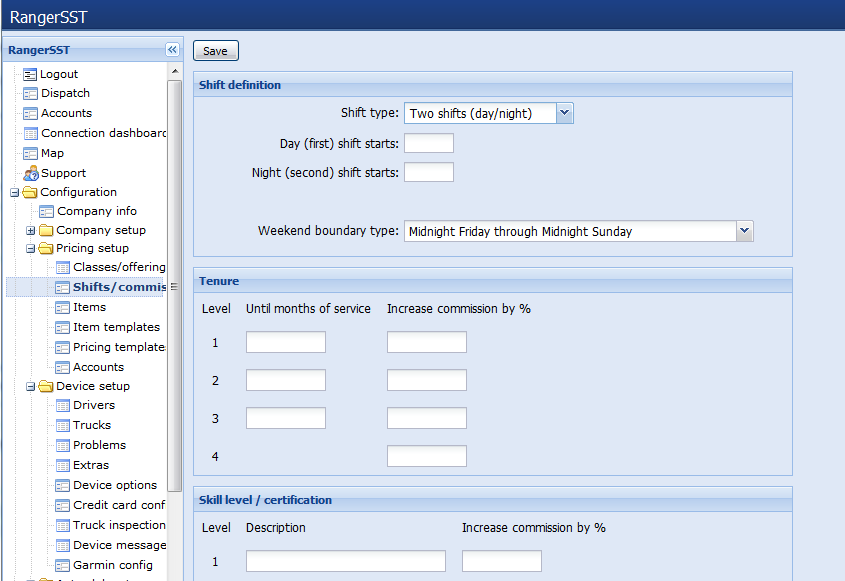 To set up shifts in Ranger SST, from the RangerSST slideout, open Configuration, then Pricing Setup and click on the “Shifts/commission”.