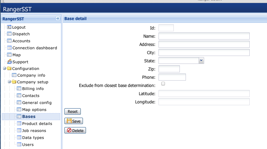 To set up Bases, you will need to enter each base with a physical address that can be geocoded properly. Go to Configuration/Company setup/Bases and enter the Name (recognizable to dispatchers), address, and click on Save.