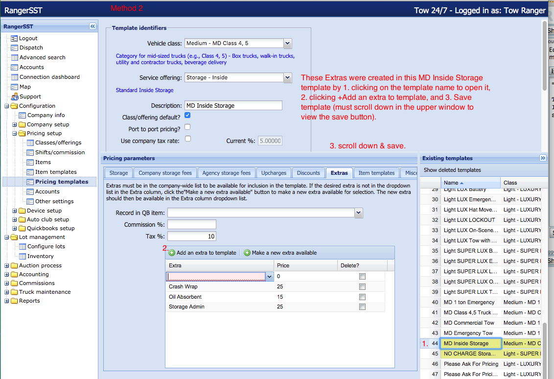 2. Alternatively, those charges can be added directly to the Storage Template under the “Extras” tab that is already part of the Pricing Template.