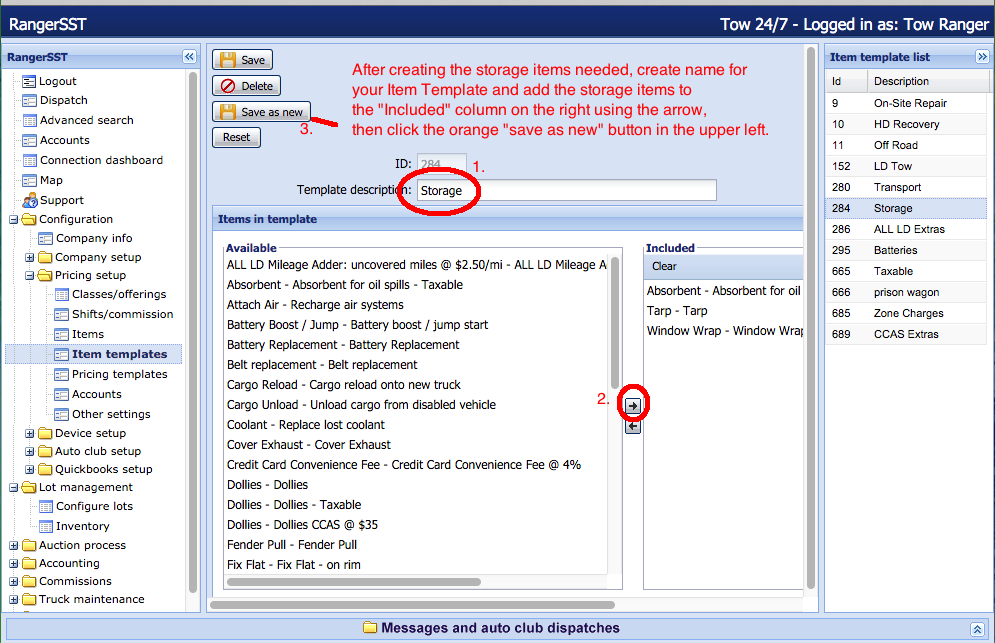 1. Create and name the charges as “items” and group to create an “item template” that can be attached to a pricing template for Storage.
