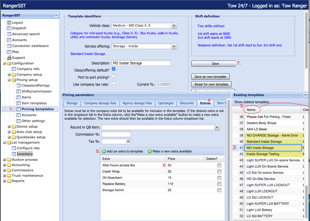 From Lot Management in RangerSST, for the MD Inside Storage pricing template, note the extras available from the Vehicle Pricing tab below exactly match those on the MD Inside Storage template above. This is because this MD Inside Storage template was selected by the lot attendant when admitting the vehicle into the lot. The Extras are attached to each storage pricing template under the “Extras” tab in pricing parameters/pricing templates.