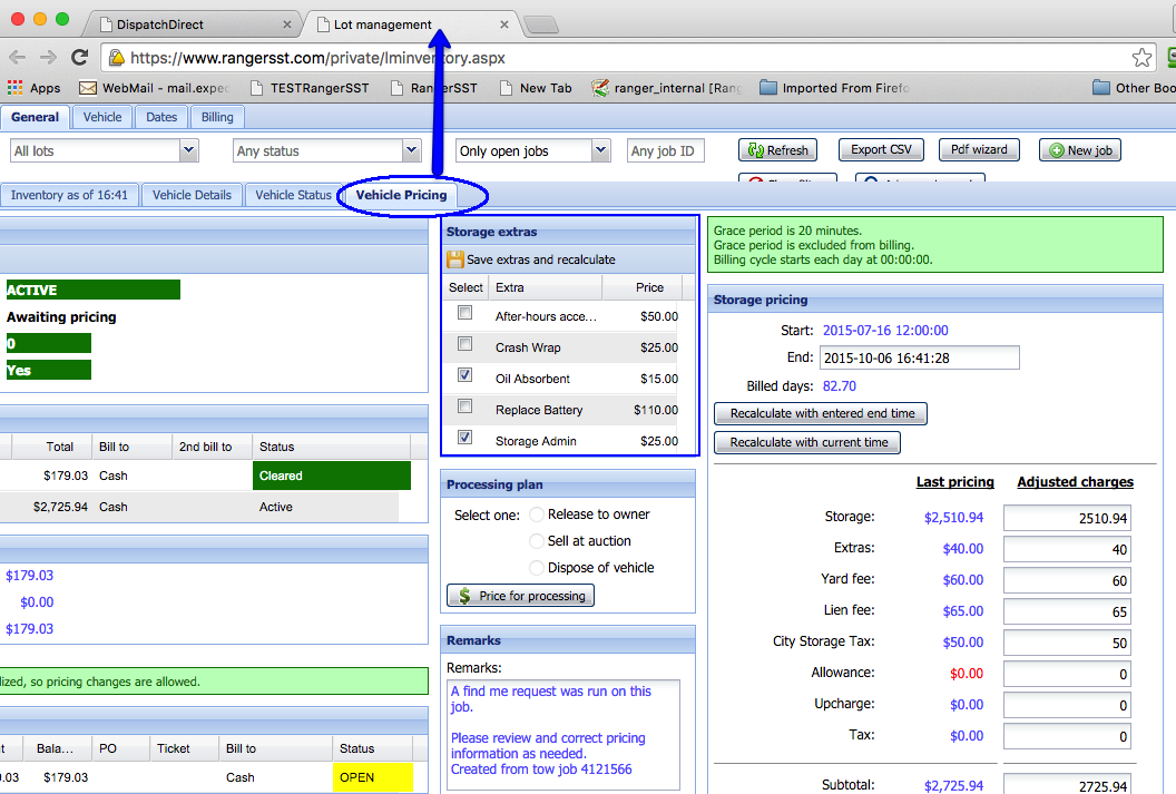 Extras are additional charges applicable to a storage job, such as an after-hours access fee, storage admin fee, plastic to cover a window, etc. These extras are added by the lot manager before a vehicle is discharged.