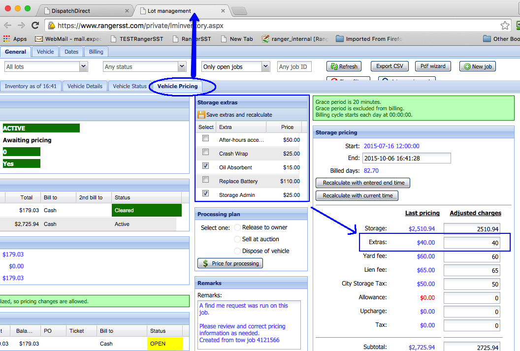 Extras are additional, flat-rate charges applicable to a storage job, such as an after-hours access fee, storage admin fee, plastic to cover a window, etc. These extras are added by the lot manager before a vehicle is discharged.