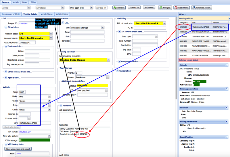 Clicking on the vehicle in pending opens up a new vehicle details screen initializing the storage job that is now linked to the tow job. Vehicle information is imported into the screen, and the lot attendant has the opportunity to: