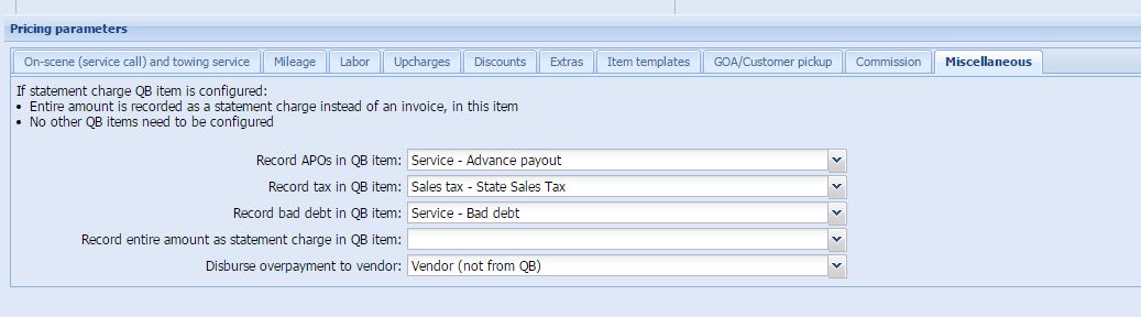 • 5: In “Statement charge Configuration” choose the Item from QuickBooks: “Towing/Service Charges”