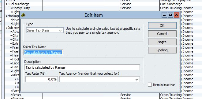 • Another side benefit of using the Tax calculated by Ranger sales tax item is that the Tax Code of all items can be set properly to taxable, non-taxable, etc., as shown below: