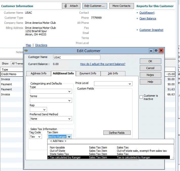 • This is the sales tax item that Ranger uses to configure a customer if it needs to create a new customer in QB. Conside the customer USAC below and its Sales Tax Information settings: