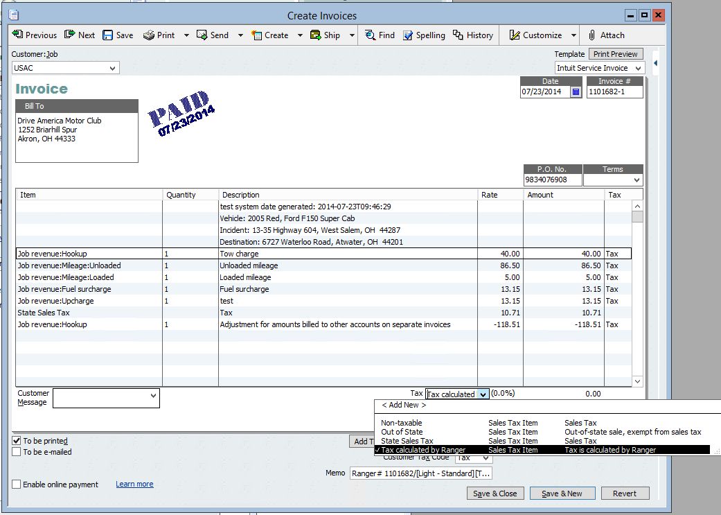 • Since Ranger has already calculated tax and included it as an invoice line item, we need the Tax drop-down at the bottom to result in $0 of tax, which is why the customer tax item is set to Tax calculated by Ranger.
