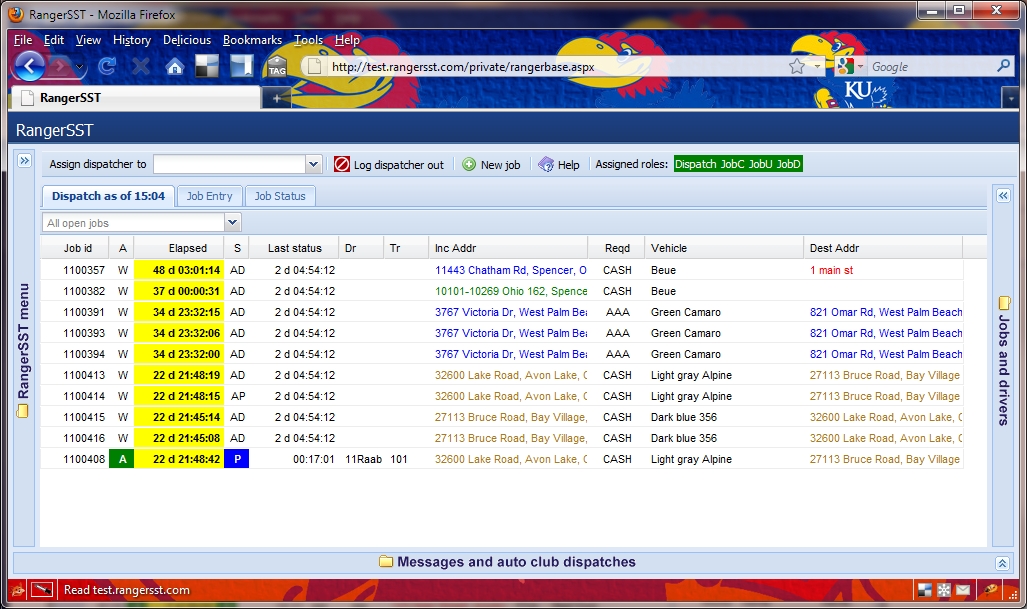 | S (job status) | For active calls: AP: approved, awaiting assignment AD: driver assigned or unassigned E: enroute A: arrived H: hooked D: dropped P: awaiting pricing T: transmitting assignment F: failed to transmit assignment For closed calls: C: cleared G: GOA X: cancelled |
