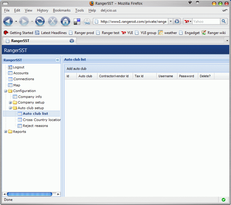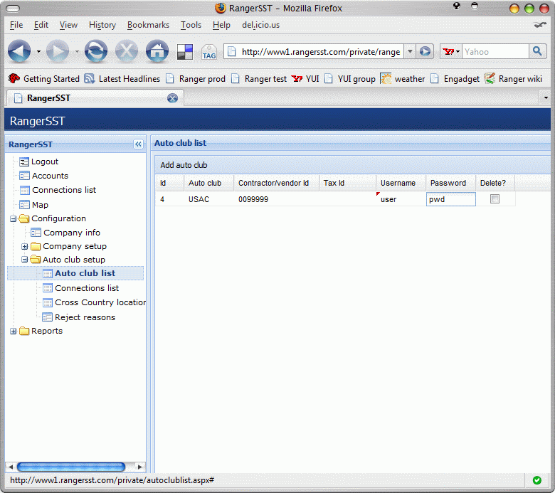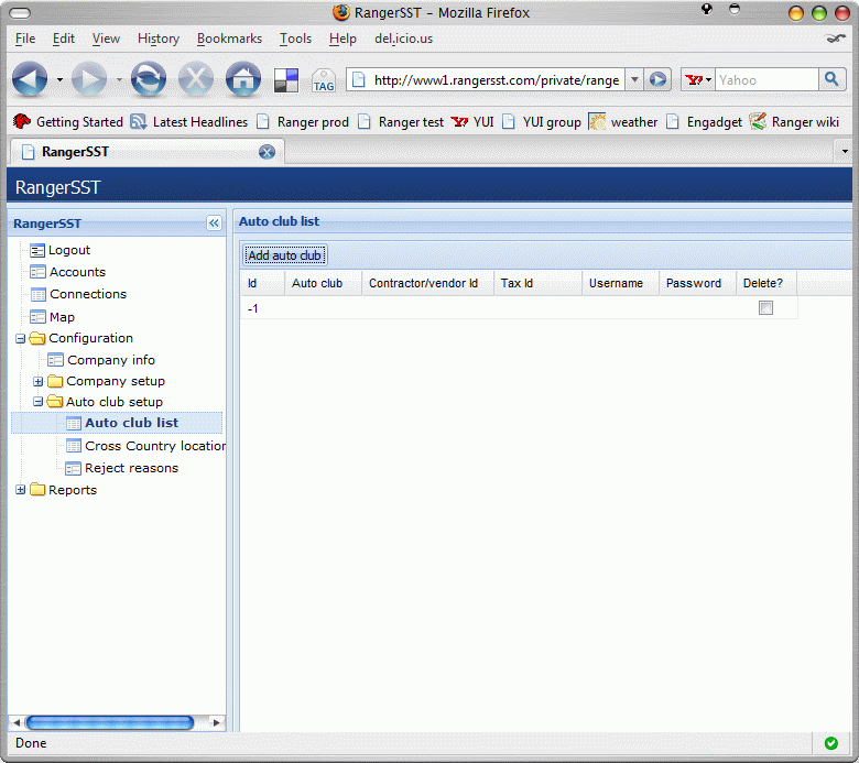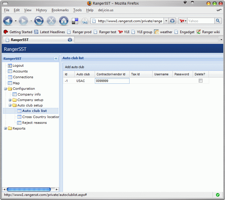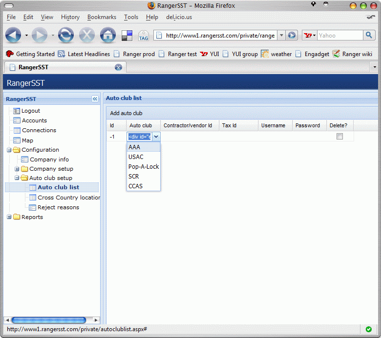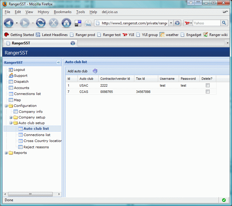 This will display the list of all configured auto club accounts for the company, as shown below.