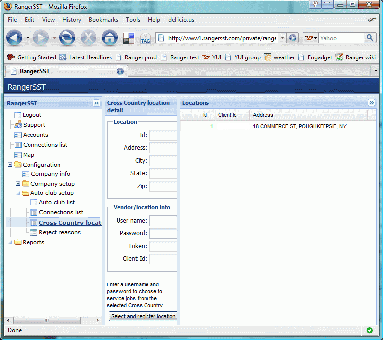 • If the configured vendor ID and tax ID match CCAS records, you should see a list of one or more CCAS locations with which the tow company has been associated in the right pane, as shown below.