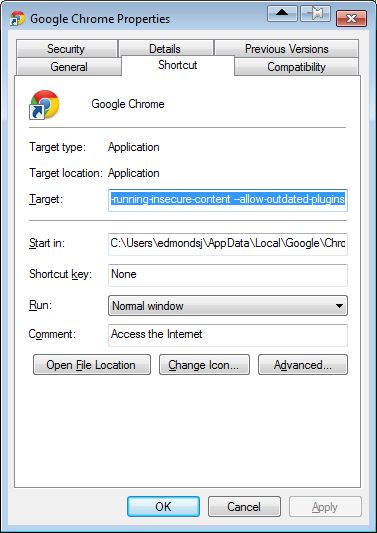 • Click in the Target field, go to the end, and add the text –allow-outdated-plugins to the end of the text in the Target field, as shown above. Make sure that you add a space before the , which is a double dash.