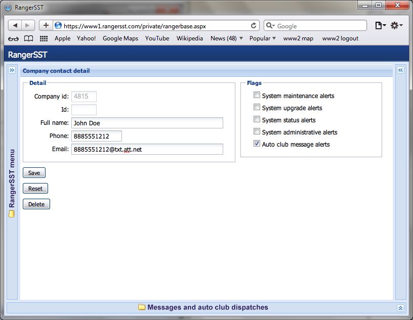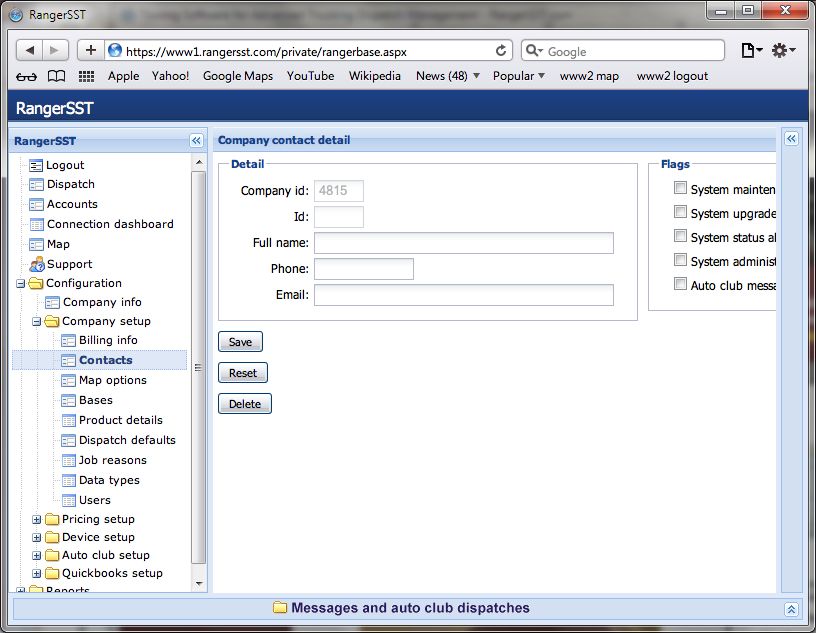 • Once you've determined your email address to text message format, login to Ranger and navigate to Configuration/Company setup/Contacts, as shown below: