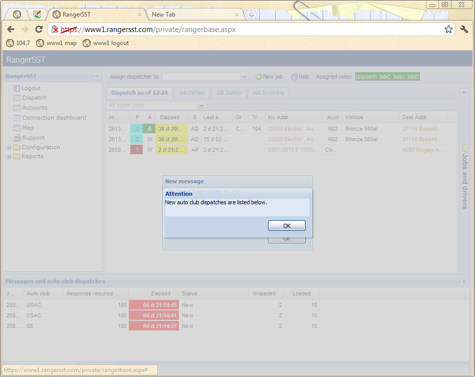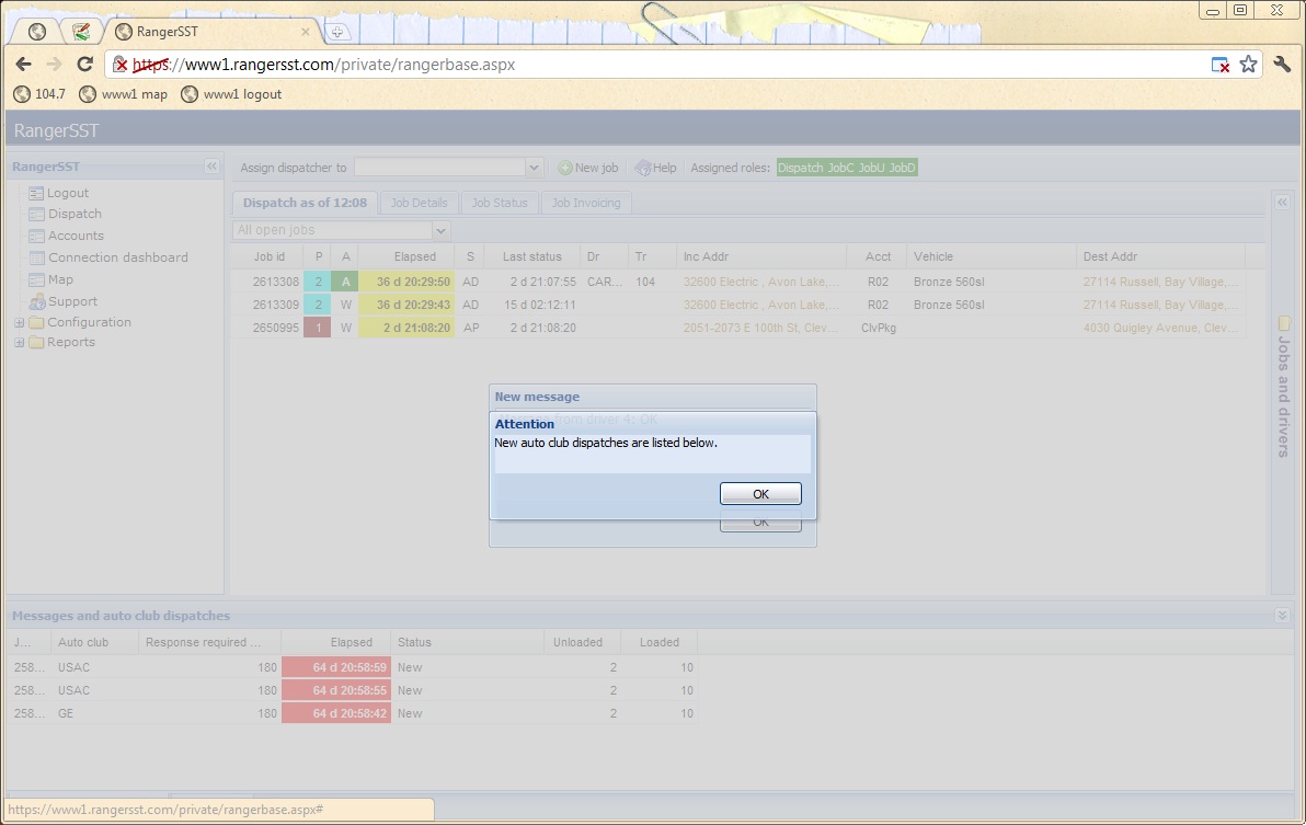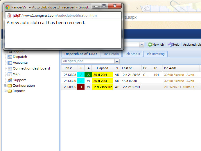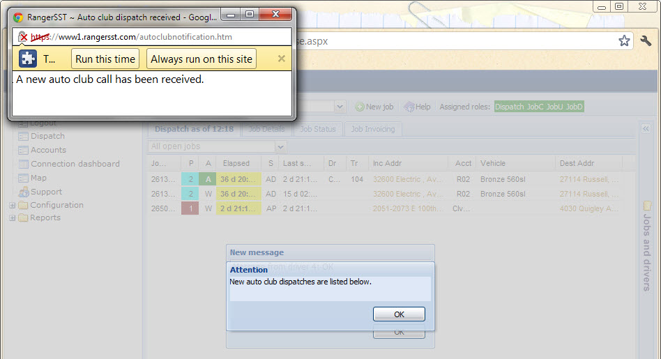 • When a new auto club dispatch is received, the bottom part of the browser window will slide open to show the waiting dispatches, and a dialog will popup, both shown below.