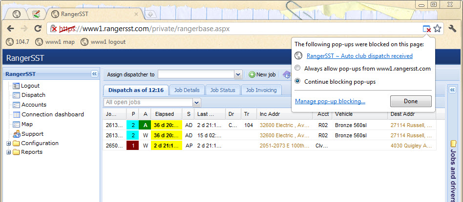 • Refresh the browser. In most browsers, this can be accomplished by typing Ctrl-R. Otherwise, click the Reload button to the left of the address bar. If you have a dispatch waiting, you should now see the popup. If not, restart the browser and log in again. If you still don't see the pop-up, contact Ranger support.