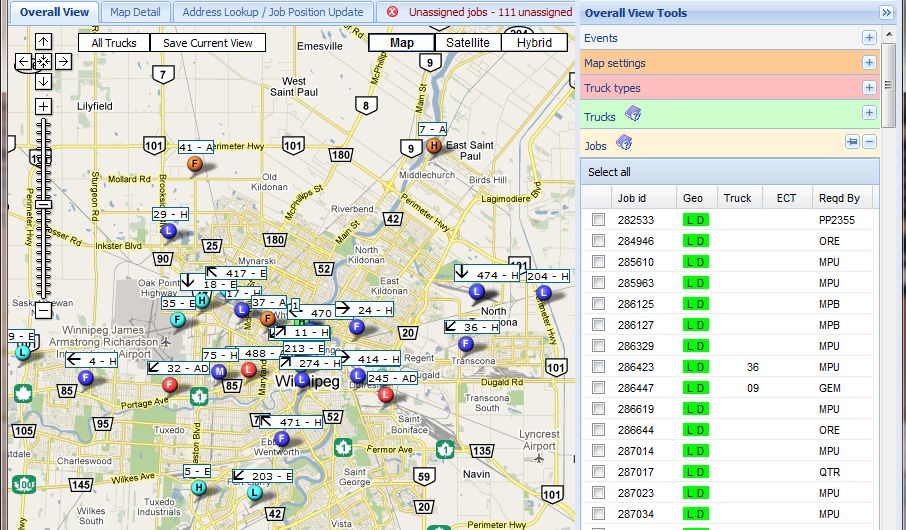 • Checking the checkbox will show the the pins of the geocoded addresses of the job, and clearing the checkbox will hide the job pin(s). A pin will be shown for each address that is shown as green in the Geo column.