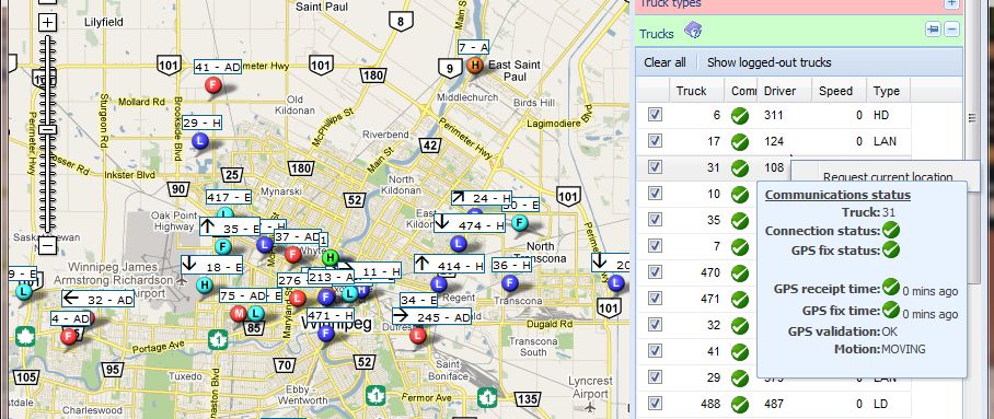 A warning is indicated for comms status if nothing has been received from the truck in more than 3 times the GPS push interval specified for the company.