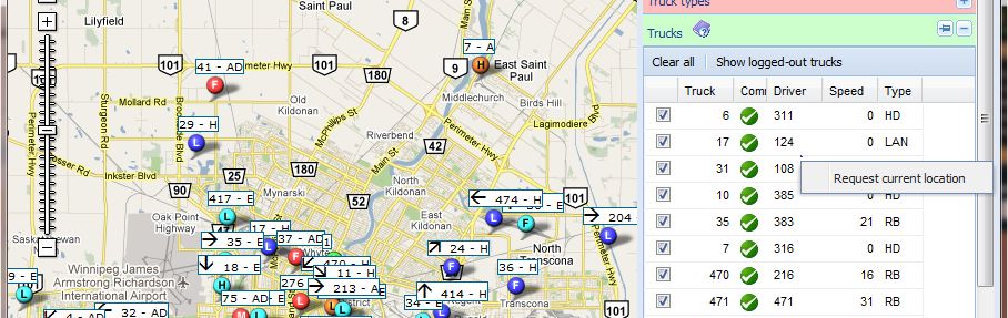 Clicking on the truck row will center the map on the truck.