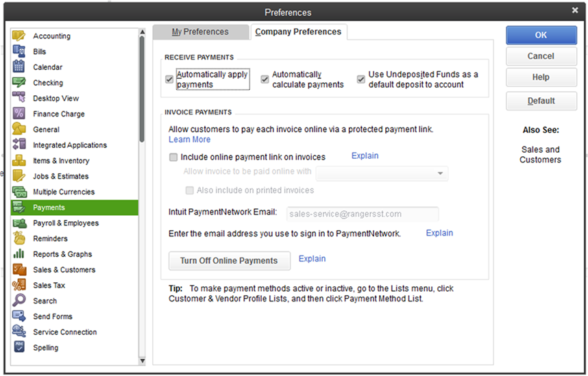 Go to Edit » Preferences » Payments » Company Preferences