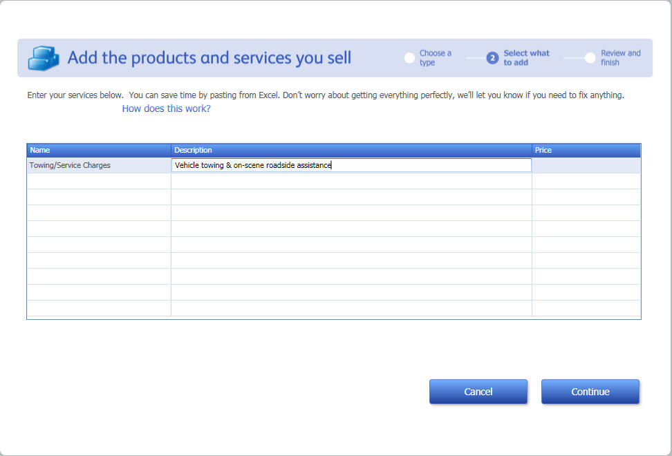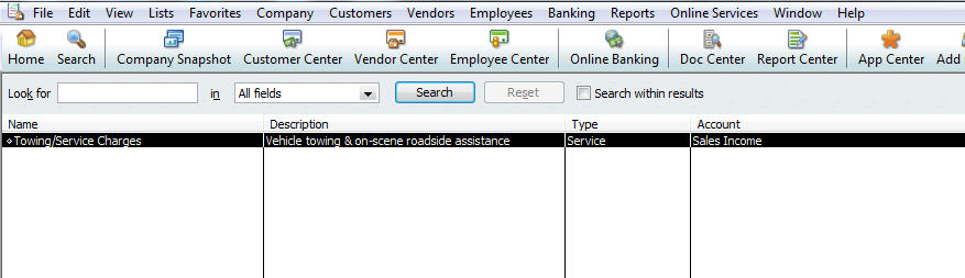 • 2: Enter the product/service name and description into the QB table. For example: Name: Towing/Service Charges; Description: Vehicle towing & on-scene roadside assistance.