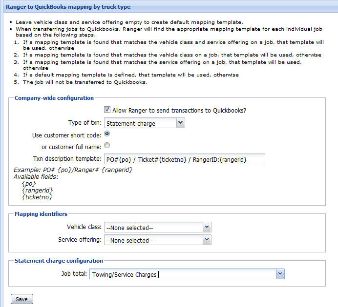 • Ranger is an input source to QuickBooks - providing all of the necessary detail to record the appropriate revenue from the towing and recovery business. Information flows from Ranger to QuickBooks - one-way. Changes to records in QuickBooks do not flow back to Ranger