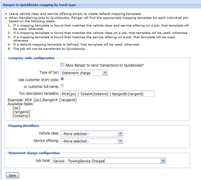 • For example, the structure of: PO#{po} / Ticket#{ticketno} / RangerID:{rangerid}, will show in the description field on the QuickBooks invoices as: