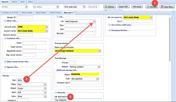 Enter the vehicle information (it cannot be pulled from the tow job details), choose account, template, bill to, etc. Choose your lot from the Lot dropdown menu.